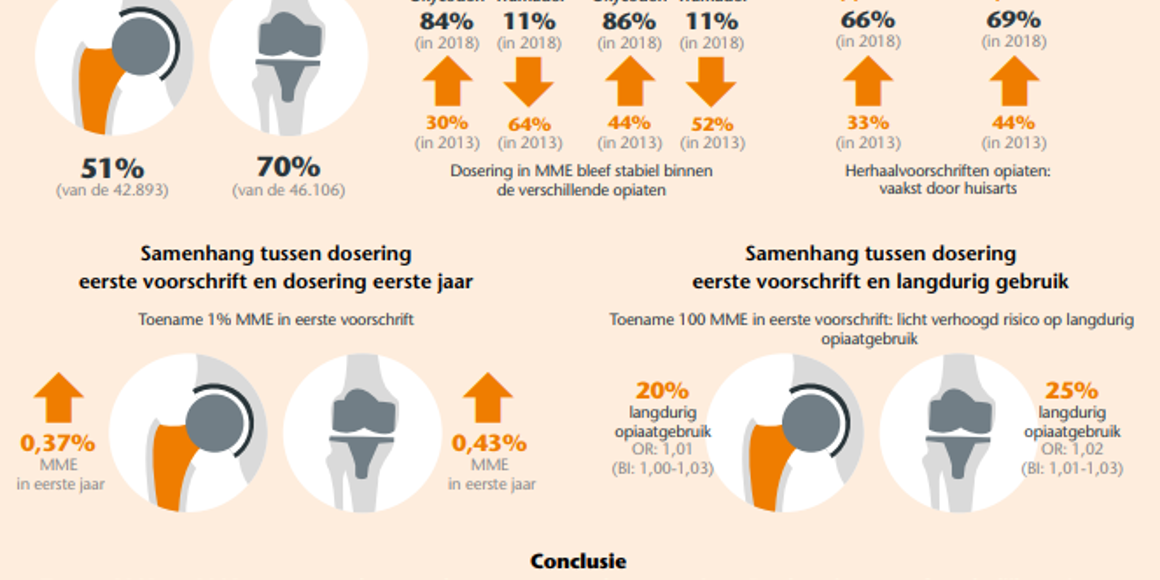 Het onderzoek is gefinancierd met LROI-subsidie en uitgevoerd met LROI-data door Heather van Brug, Rob Nelissen, Frits Rosendaal, Liza van Steenbergen, Eveline van Dorp, Marcel Bouvy, Albert Dahan en Maaike Gademan. Zij concludeerden dat tussen 2013 en 2018 oxycodon toenam als eerst voorgeschreven opiaat. De dosering van afzonderlijke opiaten bleef bij het eerste voorschrift redelijk stabiel. De hoeveelheid voorgeschreven opiaten bij het eerste voorschrift bleek samen te hangen met een toename in de totale hoeveelheid voorgeschreven opiaten in het jaar na de prothese-ingreep en met een kleine toename in het risico op langdurig gebruik. Eerste opiaatvoorschriften werden steeds vaker door orthopeden gedaan. De huisarts schreef het vaakst herhaalvoorschriften voor. Waarom het aantal opiaatvoorschriften toenam moet verder worden onderzocht.
